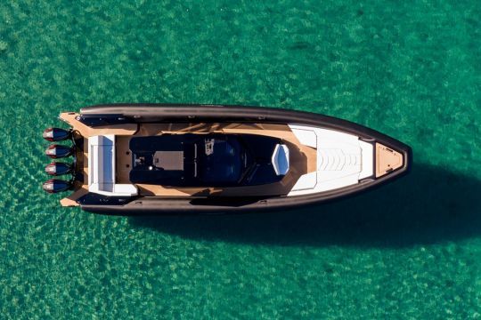 El segundo punto clave es la relación manga/eslora. Con una manga de 4,30 m para una eslora total de 13,80 m, el Alpha 45 tiene una manga generosa para una semirrígida (incluso una semirrígida deportiva). Esta elección estructura la disposición de la cubierta.