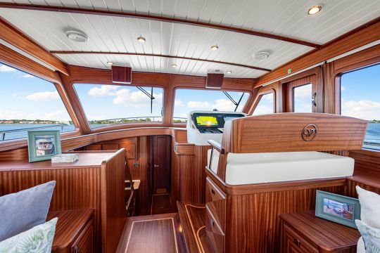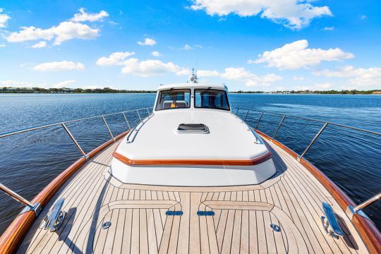 Las cubiertas laterales, la plataforma de baño, las mesas de bañera y las bordas siguen siendo de teca. Se trata de un yate compuesto o de madera, pero con un acabado tradicional.