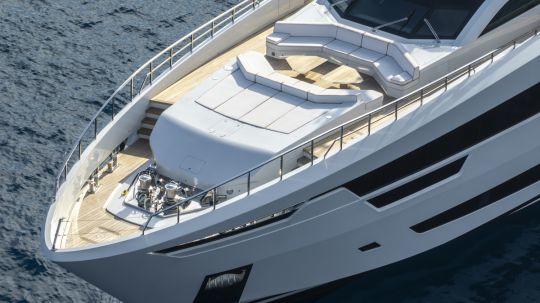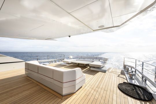 El solárium, con una superficie de más de 50 m², combina varias funciones: una zona de sombra bajo el hard-top, zonas para tomar el sol y un jacuzzi. Un bar y una pantalla escamoteable permiten pasar al uso nocturno. También integra dos asientos para el timón, que ofrecen una posición de navegación avanzada.