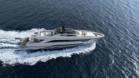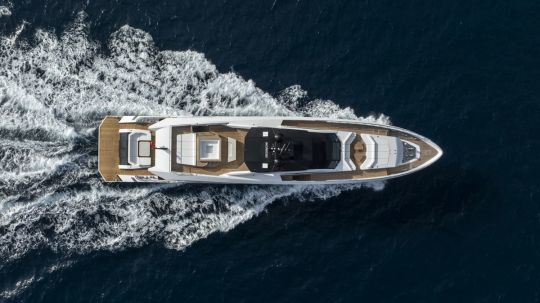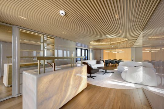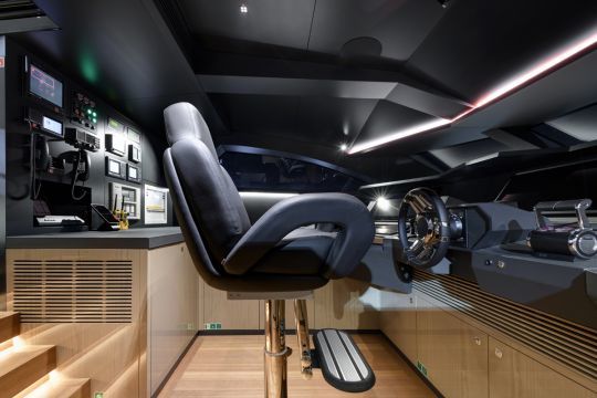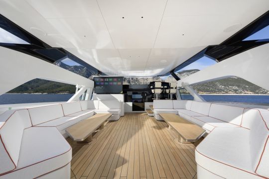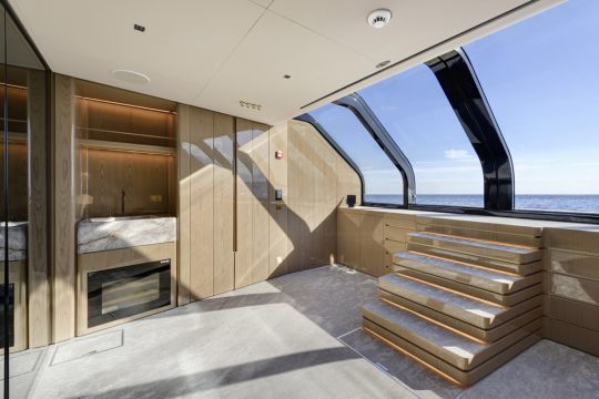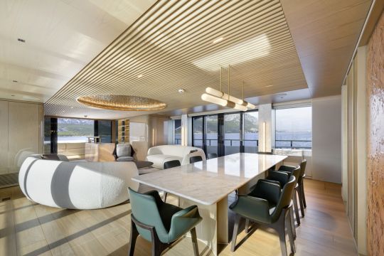 El diseño interior, creado por Yodezeen con los equipos del astillero, se basa en una estética de loft. El ónice marfil se utiliza tanto en el bar como en la mesa del comedor, mientras que el suelo de roble evoca las cubiertas exteriores de teca.