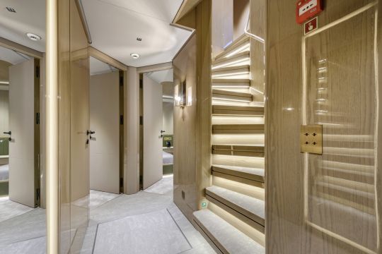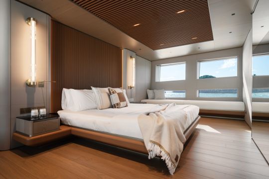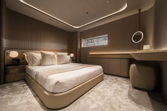 La suite del propietario, situada en la parte delantera de la cubierta principal, supera los 50 m². Incluye dos cuartos de baño unidos por una ducha central y un vestidor de ancho completo. Los camarotes de invitados siguen las mismas líneas, con variaciones en materiales como el travertino y el mármol.