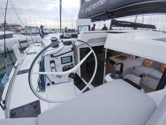 El Outremer 48 tiene una configuración mixta, con timón de rueda basculante a babor y timón de caña a estribor.
