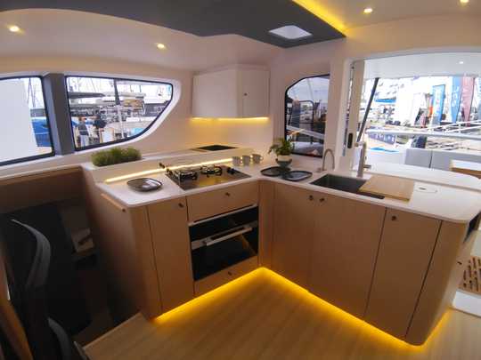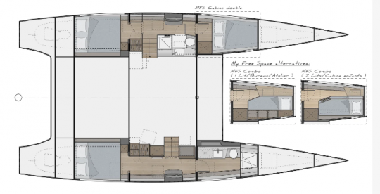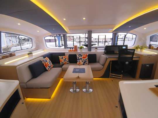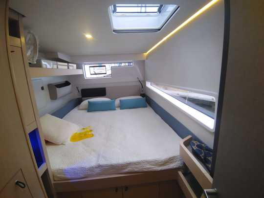 La distribución interior se basa en dos camarotes por casco, con instalaciones sanitarias separadas. El aseo y la ducha están separados, lo que facilita la vida a bordo a varias personas.