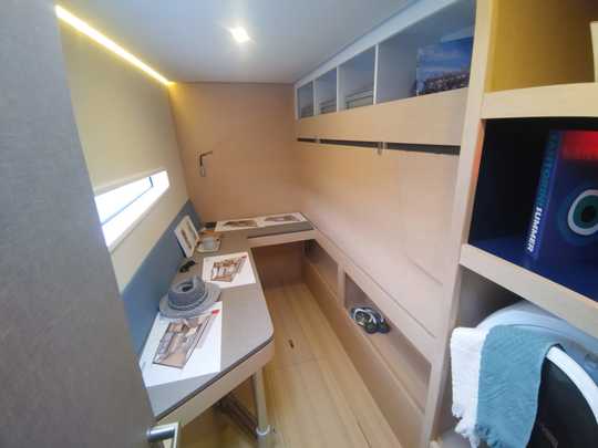 El camarote de babor se caracteriza por su modularidad. Despacho, litera doble, literas, las configuraciones varían según el programa. Para una tripulación familiar o invitados de visita, esta flexibilidad ofrece una solución real.