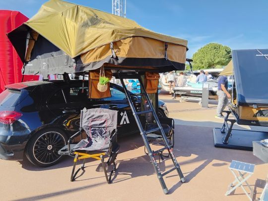 Además de los flotadores, también me impresionó la marca suiza Swisskings, que ofrece tiendas de techo que transforman cualquier vehículo en un vehículo listo para la aventura, con el máximo confort. También ofrecen toda una gama de accesorios plegables, como asientos y mesas. Todo forma parte del espíritu del excursionismo independiente y libre.